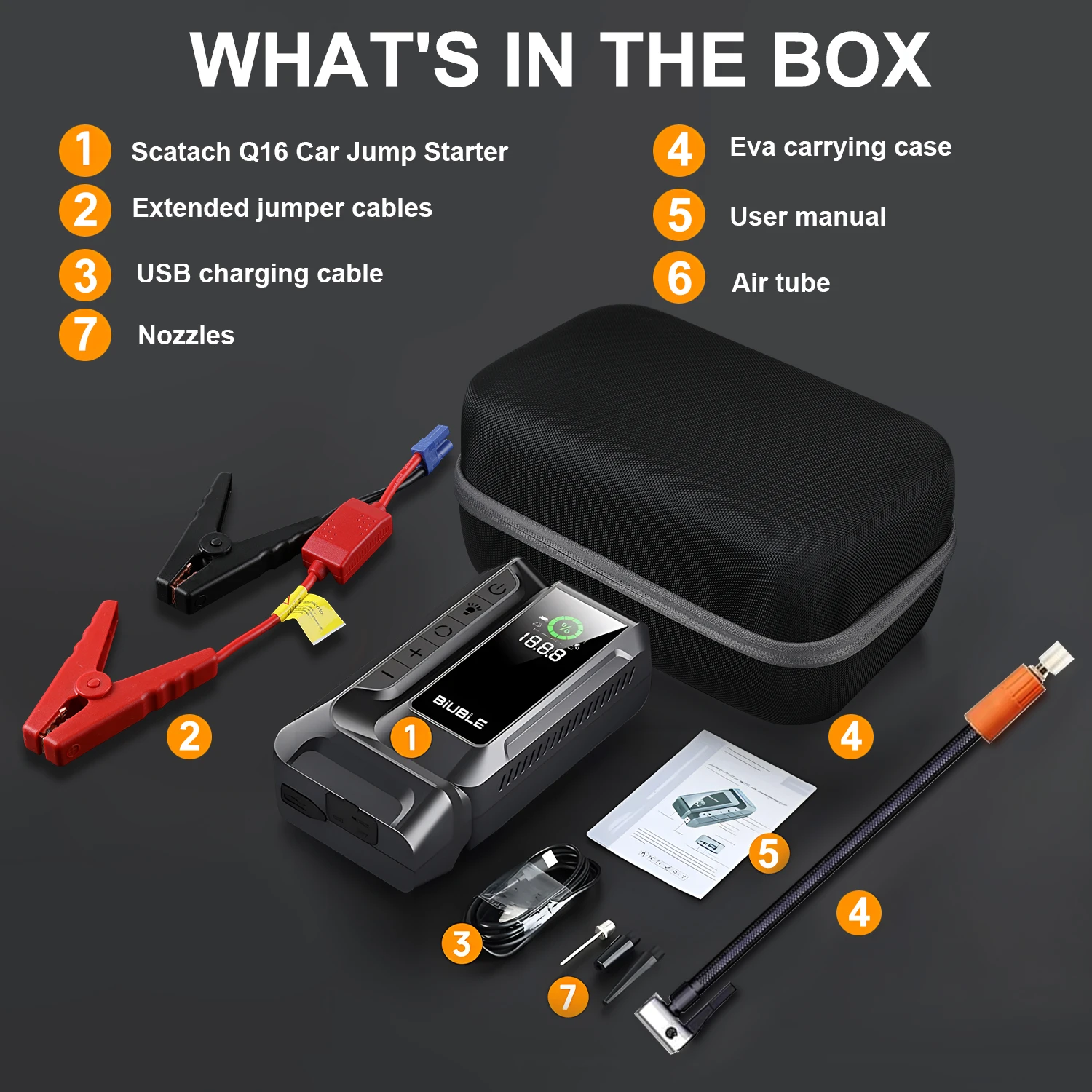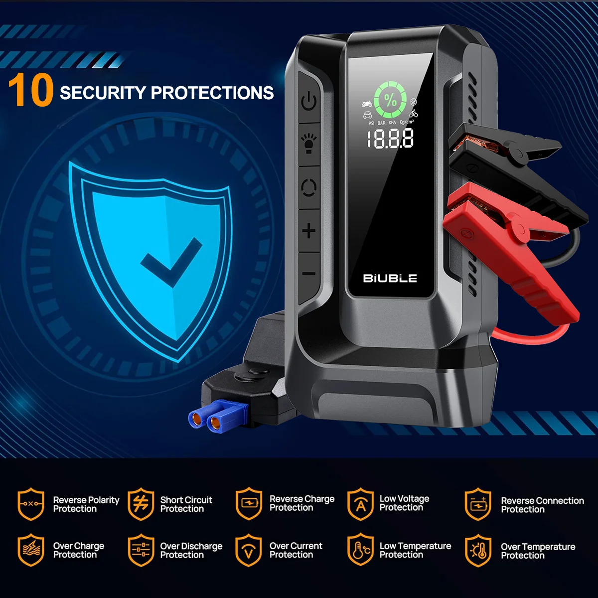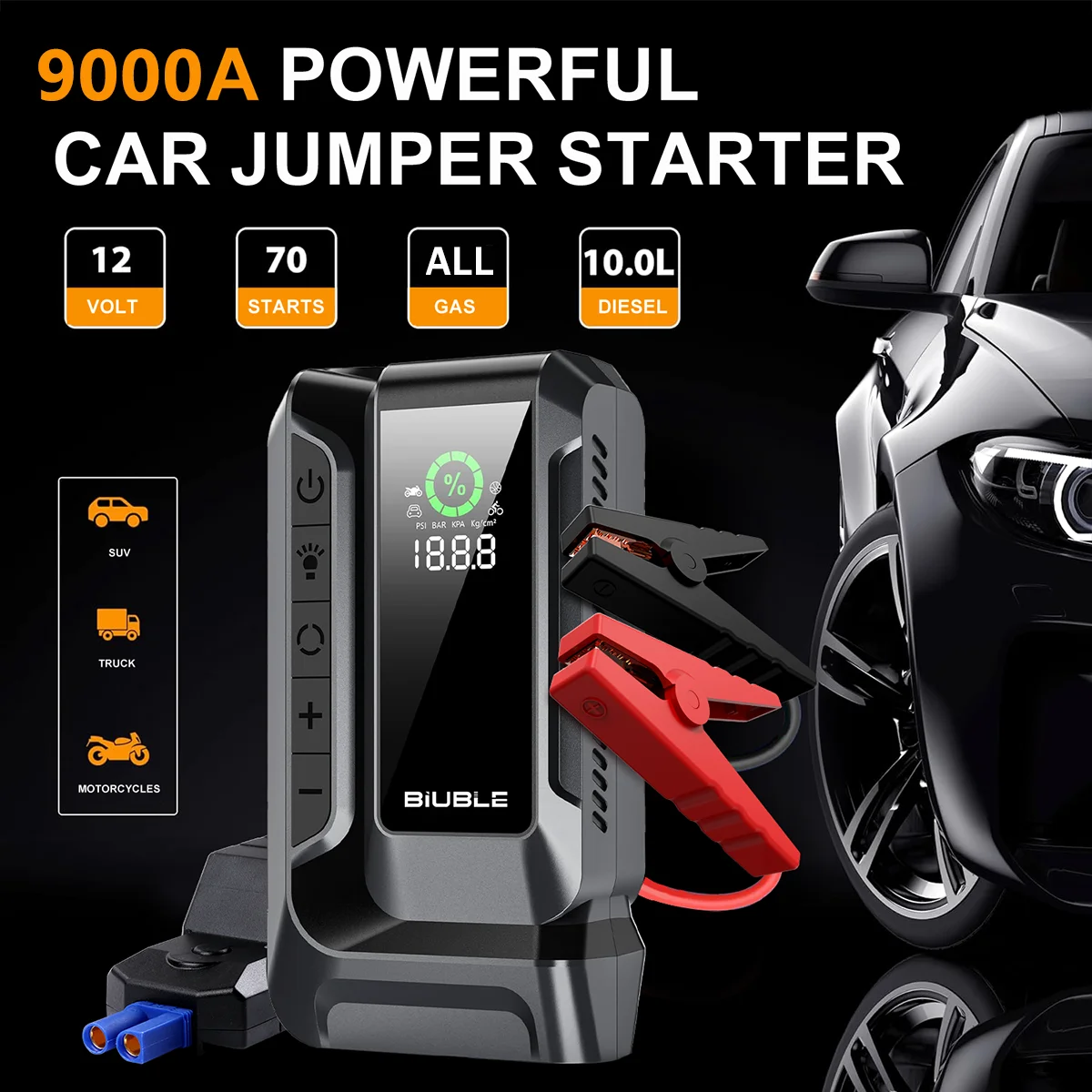 The BIUBLE Q16 is equipped with a powerful 9000A car jump starter and a 160 PSI air compressor to ensure you can start your car immediately and inflate your tires. No more waiting for rescuers or searching for nearby gas stations to inflate your tires. With its built-in monitor, you can easily monitor the pressure and ensure the best inflation effect is achieved every time.